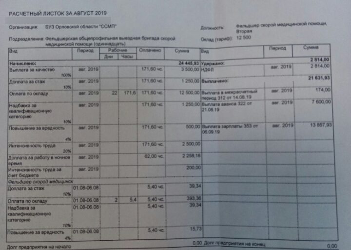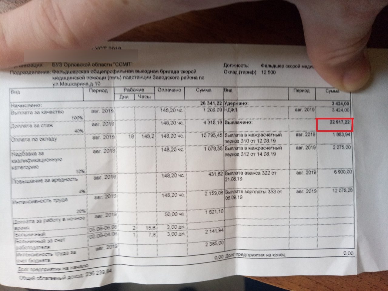 Это зарплата фельдшера скорой помощи чуть меньше, чем за ставку. Причём, данный сотрудник проработал уже 7-8 лет.