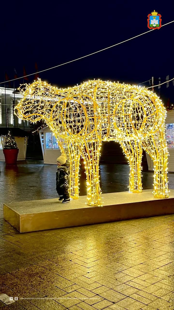 Три светящихся зубра появились прямо в центре площади Ленина, возле праздничных шале и новогодней ёлки.