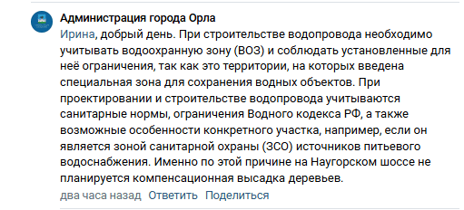 «При строительстве водопровода необходимо учитывать водоохранную зону (ВОЗ) и соблюдать установленные для неё ограничения, так как это территории, на которых введена специальная зона для сохранения водных объектов. При проектировании и строительстве водопровода учитываются санитарные нормы, ограничения Водного кодекса РФ, а также возможные особенности конкретного участка, например, если он является зоной санитарной охраны (ЗСО) источников питьевого водоснабжения. Именно по этой причине на Наугорском шоссе не планируется компенсационная высадка деревьев», — указывается в ответе с аккаунта пресс-службы городской администрации.