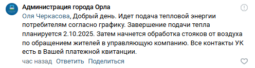 «Идёт подача тепловой энергии потребителям согласно графику. Завершение подачи тепла планируется 2.10.2025. Затем начнётся обработка стояков от воздуха по обращением жителей в управляющую компанию. Все контакты УК есть в Вашей платежной квитанции», – такой текст отправляет мэрия Орла в ответ на вопросы жителей.