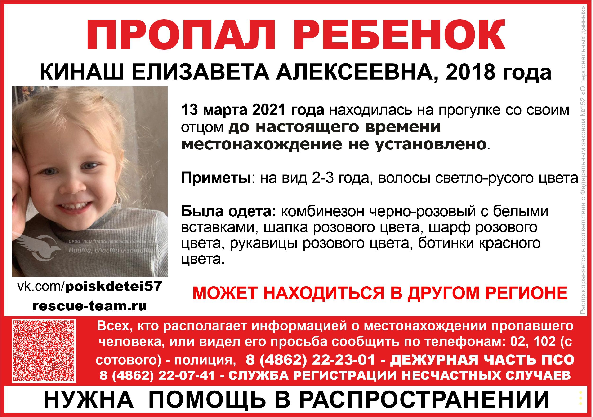 В Орле без вести пропала Кинаш Елизавета Алексеевна 2018 года рождения.