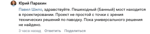 «Пешеходный (Банный) мост находится в проектировании. Проект непростой с точки с зрения технических решений по паводку. Пока универсального решения не найдено», — ответил мэр Орла Юрий Парахин.