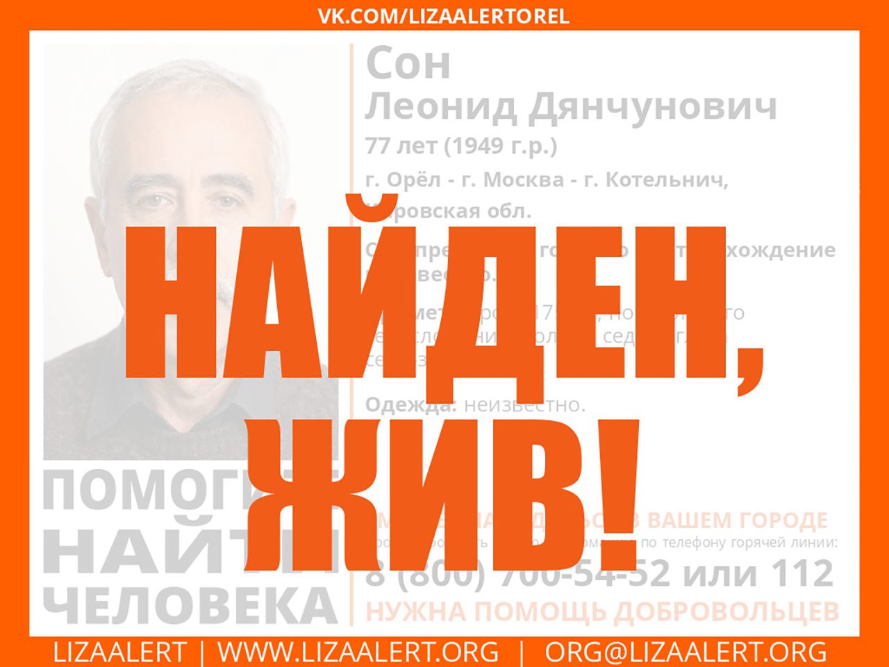 Сотрудники УМВД выяснили, что Леонид Сон мог уехать в другой регион. Если точнее, в Московскую или Кировскую область. Активисты связались с поисковиками из этих регионов и попросили распространить ориентировку. И это сработало!