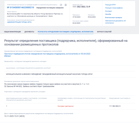 Информация об этом опубликована на портале «Госзакупок». Контракт был расторгнут 12 ноября 2025 года по соглашению сторон. Из 111,3 млн рублей общей суммы контракта стоимость исполненных поставщиком составила 109,9 млн рублей.