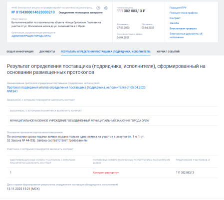 Информация об этом опубликована на портале «Госзакупок». Контракт был расторгнут 12 ноября 2025 года по соглашению сторон. Из 111,3 млн рублей общей суммы контракта стоимость исполненных поставщиком составила 109,9 млн рублей.