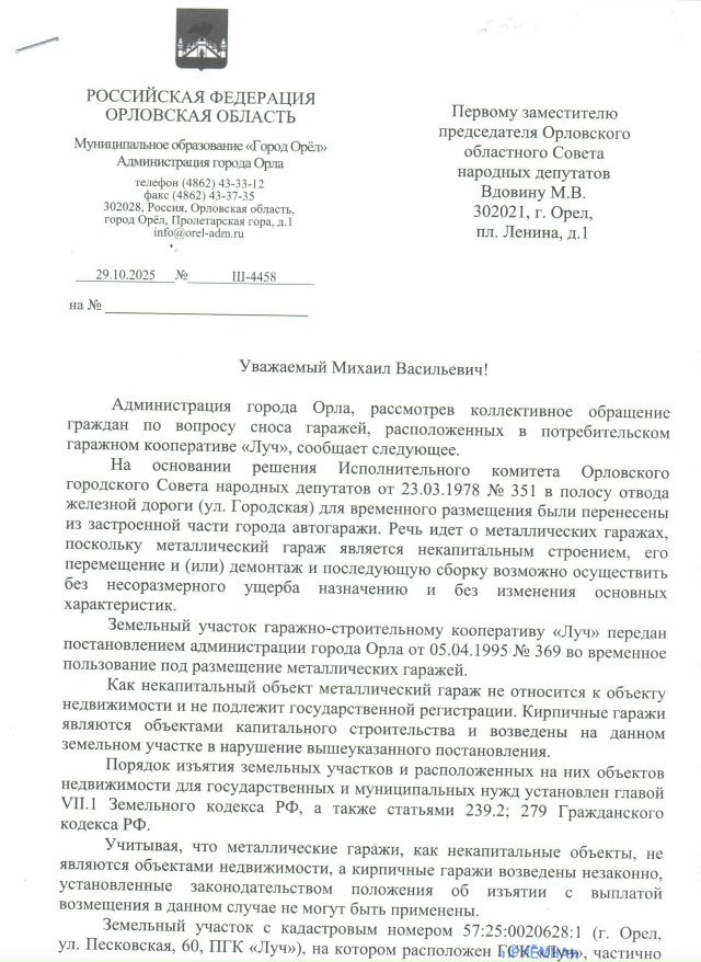 «Сегодня получил ответ на мой депутатский запрос из администрации города Орла, по вопросу сноса гаражей, расположенных в ПГК «Луч». Судя из ответа под снос, попадают 102 гаража, – написал Вдовин.