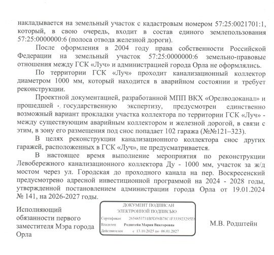 И.о. первого заместителя мэра Орла Мария Родштейн сообщила, что земельно-правовые отношения между ГСК «Луч» и администрацией Орла не оформлялись. А для ремонта канализационного коллектора, который проходит под гаражами, возможен единственный вариант – это снос 102 гаражей ГСК «Луч».