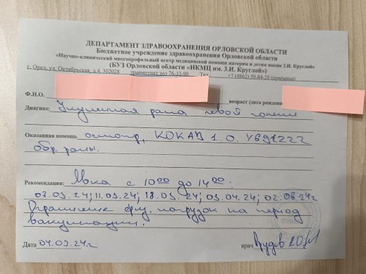 Как уточняют «Орловские новости», собака резко приблизилась и укусила ребёнка за ногу: «Сын её не увидел, потому что она подошла сзади. От неожиданности и боли он начал падать. Собаку я не с первого раза смогла отогнать, она и на меня начала нападать. После инцидента мы поехали в травмпункт на Дворянку», — добавила Ашихмина.