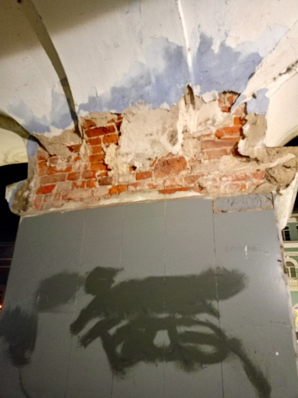 На объекте установлена табличка, предупреждающая жителей о том, что в «опасную зону» лучше не заходить. Своды разрушились до основания: торчат кирпичи, сыпется штукатурка, отваливается облицовка.