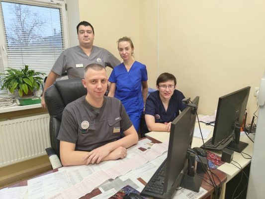 На снимке бригада врачей кардиологического отделения № 1, участвовавших в спасении пациента: в первом ряду слева направо – заведующий отделением Иван Вишняк и врач-кардиолог Иван Мельник, второй ряд – врач-кардиолог Андрей Герасин и врач-анестезиолог-реаниматолог Алина Глотова.