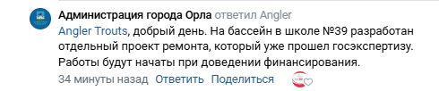 «На бассейн в школе №39 разработан отдельный проект ремонта, который уже прошел госэкспертизу. Работы будут начаты при доведении финансирования», — указывается в ответе с аккаунта пресс-службы Администрации Орла.