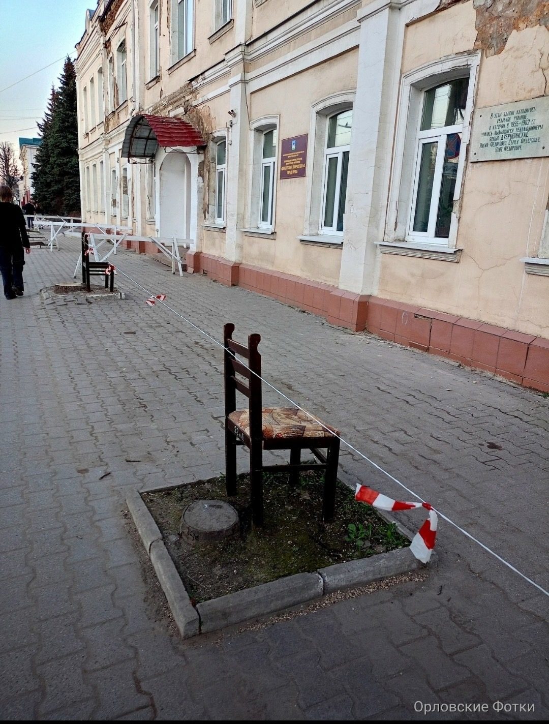В Орле стартовал ремонт пешеходной зоны на ул. Комсомольской. Здесь расположен разваливающийся Дом детского творчества. Чтобы осыпающийся фасад не обрушился ни на голову рабочих, ни на пешеходов, опасную зону огородили изолентой, приклеенной на стулья, установив их на месте вырубленных деревьев.