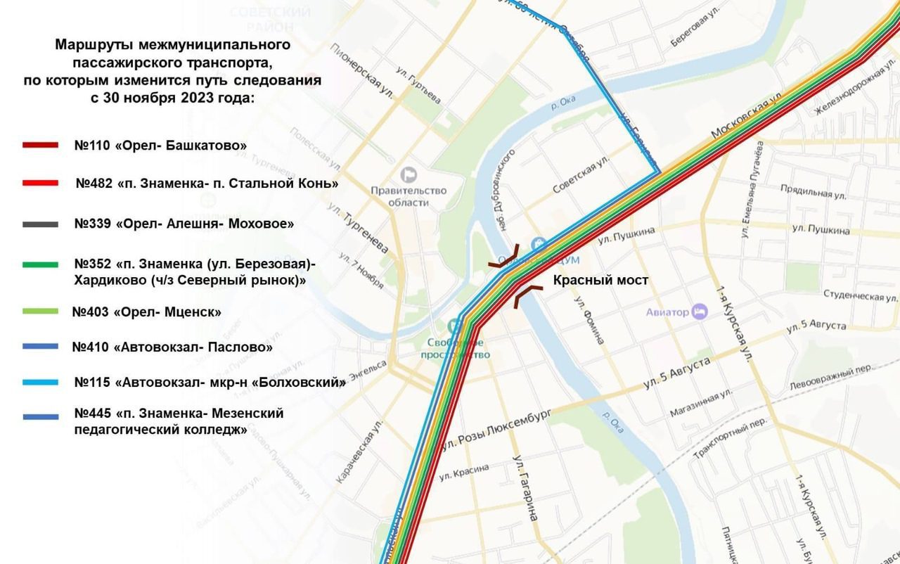 Департамент Дорожного хозяйства Орловской области опубликовал схему движения межмуниципальных «трёхзначных» автобусных маршрутов через Красный мост.