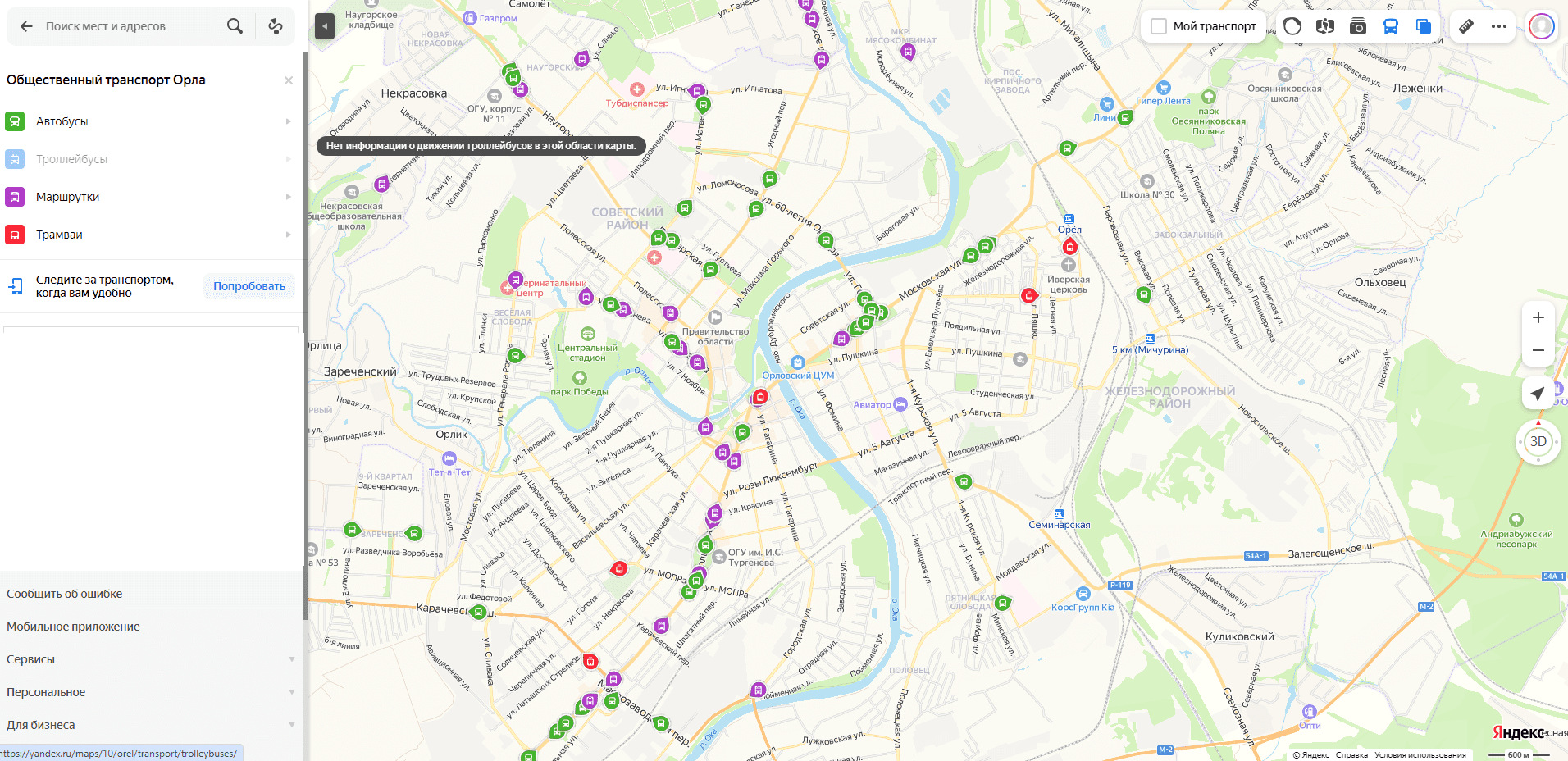 Если же судить по сервису «Яндекс. Карты», то в Орле вообще нет движения троллейбусов, потому что они вдруг перестали тут отображаться. С чем это может быть связано – неизвестно, но на данный момент при попытке отследить движение именно троллейбусов сервис демонстрирует следующую надпись: «Нет информации о движении троллейбусов в этой области карты».