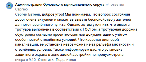 «Мы понимаем, что вопрос состояния дорог очень актуален и может вызывать беспокойство у жителей данного населённого пункта. Однако хотим уточнить, что высота тротуара выполнена в соответствии с ГОСТом, а тротуарная дорожка обустроена согласно проектно-сметной документации с учётом особенностей стеснённых условий. Что касается ливневой канализации, её установка невозможна из-за рельефа местности и стеснённых условий. Также информируем вас, что установка защитного экрана в зоне жилой застройки не предусмотрена», — указывается в ответе чиновников.