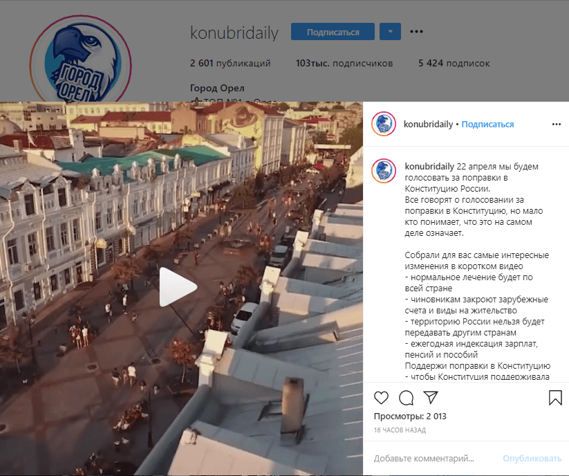 Орловским сообществам в соцсетях готовы заплатить за рекламный пост о преимуществах поправок в Конституцию немалые деньги. Такое предложение, например, поступило администраторам страницы в Инстаграм @orel365. Данный паблик не согласился зарабатывать деньги на Основном законе.