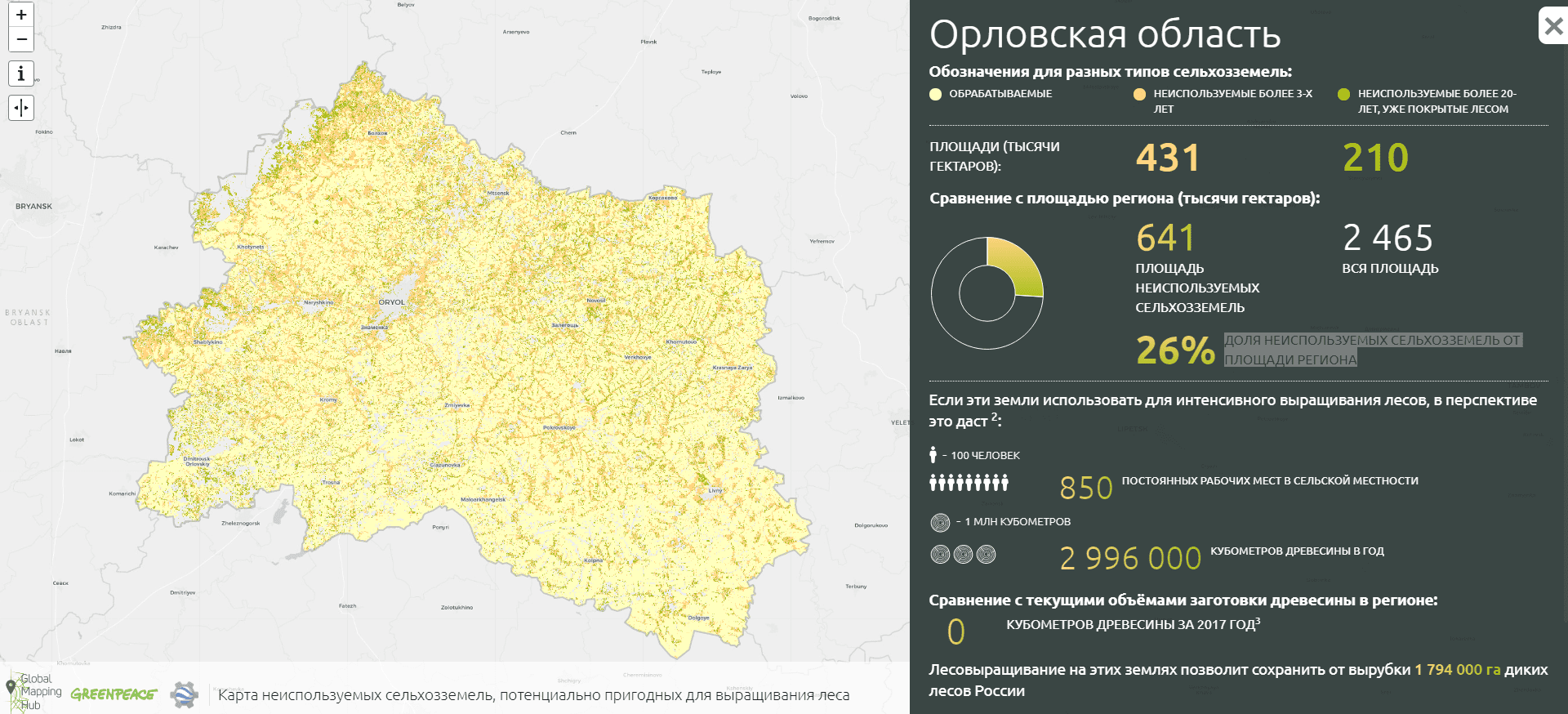 В Орловской области, по данным Greenpeace, пустуют 641 тыс. га сельхозплощади. Это 32% от общей площади земель сельскохозяйственного назначения региона!