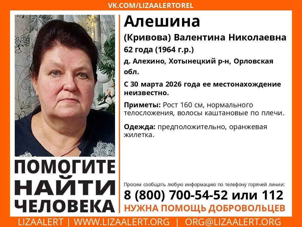 Поисковый отряд «ЛизаАлерт» опубликовал ориентировку на очередного пропавшего человека. На этот раз ведутся поиски 62-летней Валентины Николаевны Алешиной (Кривовой).