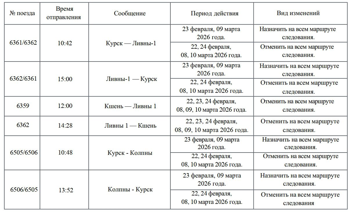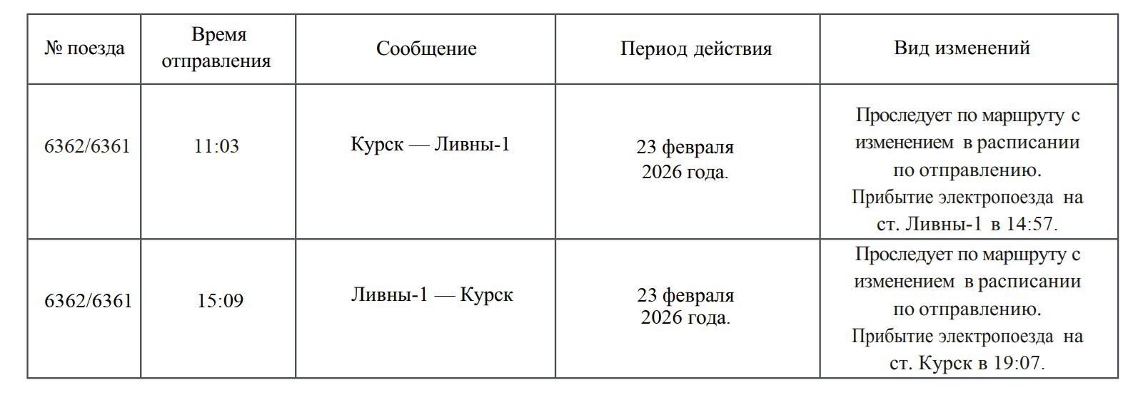 Речь идёт об электропоездах «Курск – Ливны 1», «Кшень – Ливны 1», «Курск – Колпны».
