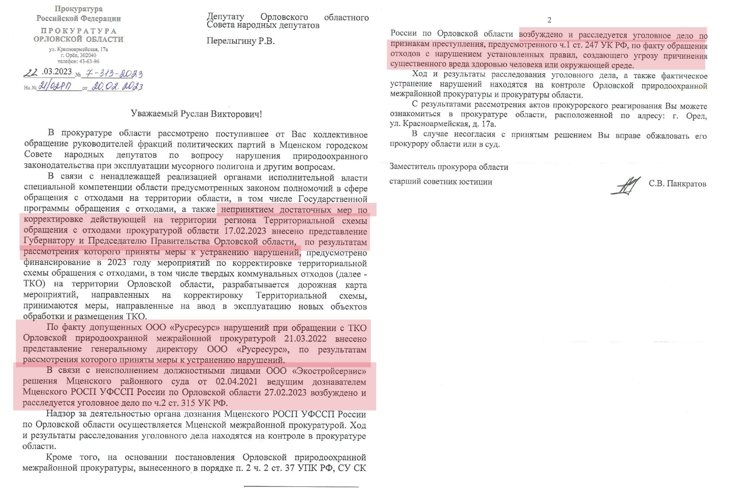 Кроме того, «в связи с неисполнением должностными лицами ООО «Экостройсервис» решения Мценского районного суда возбуждено уголовное дело по ч.2 ст.315 УК РФ «Злостное неисполнение представителем власти, государственным служащим, муниципальным служащим, а также служащим государственного или муниципального учреждения, коммерческой или иной организации вступивших в законную силу приговора суда, решения суда или иного судебного акта, а равно воспрепятствование их исполнению»», — сказано в документе, опубликованном Перелыгиным.