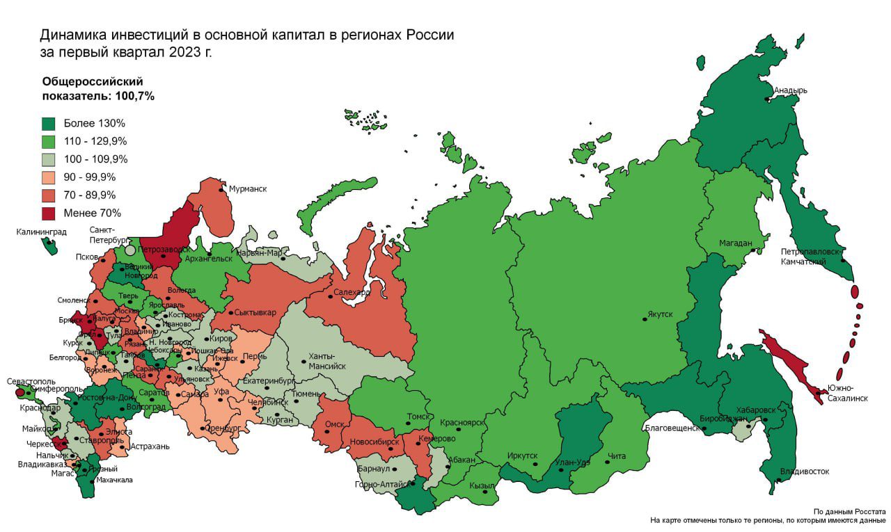 Издание «Региональная политика» проанализировало динамику инвестиций в основной капитал в регионах России за первый квартал 2023 года. Показатель по стране почти не изменился, продемонстрировав мизерный рост на 0,7% по сравнению с аналогичный периодом 2022 года.