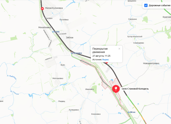 Речь идёт об участке автомобильной дороги между посёлком Куликовский и селом Становой Колодезь. Информация о перекрытии движения также размещена на «Яндекс.Картах».