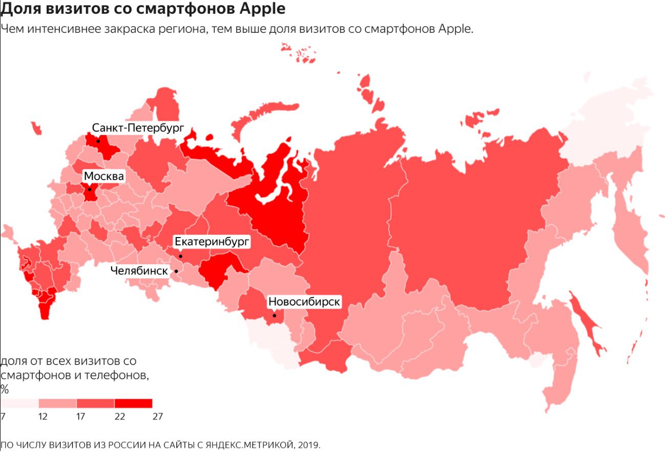 Больше всего визитов с устройств Apple в России приходится на Москву, Санкт-Петербург, за ними сразу же следуют пять кавказских регионов: Ингушетия, Дагестан, Карачаево-Черкесия, Осетия и Чечня.