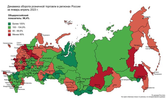 Издание «Региональная политика» проанализировало дианмику розничной торггволи по субъектам России за январь-апрель 2023 года. В целом по стране обороты упали на 3,6%.