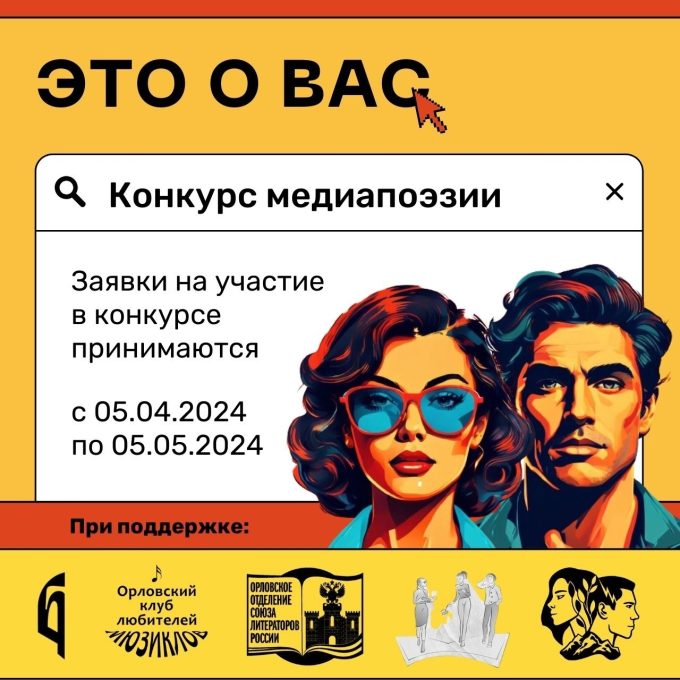 Региональное отделение «Союза литераторов» РФ при поддержке творческих групп организовало первый в Орловской области Фестиваль медиапоэзии «Это о Вас!». Он объединяет два направления современного литературного творчества — «мелодекламацию» и «видеопоэзию».