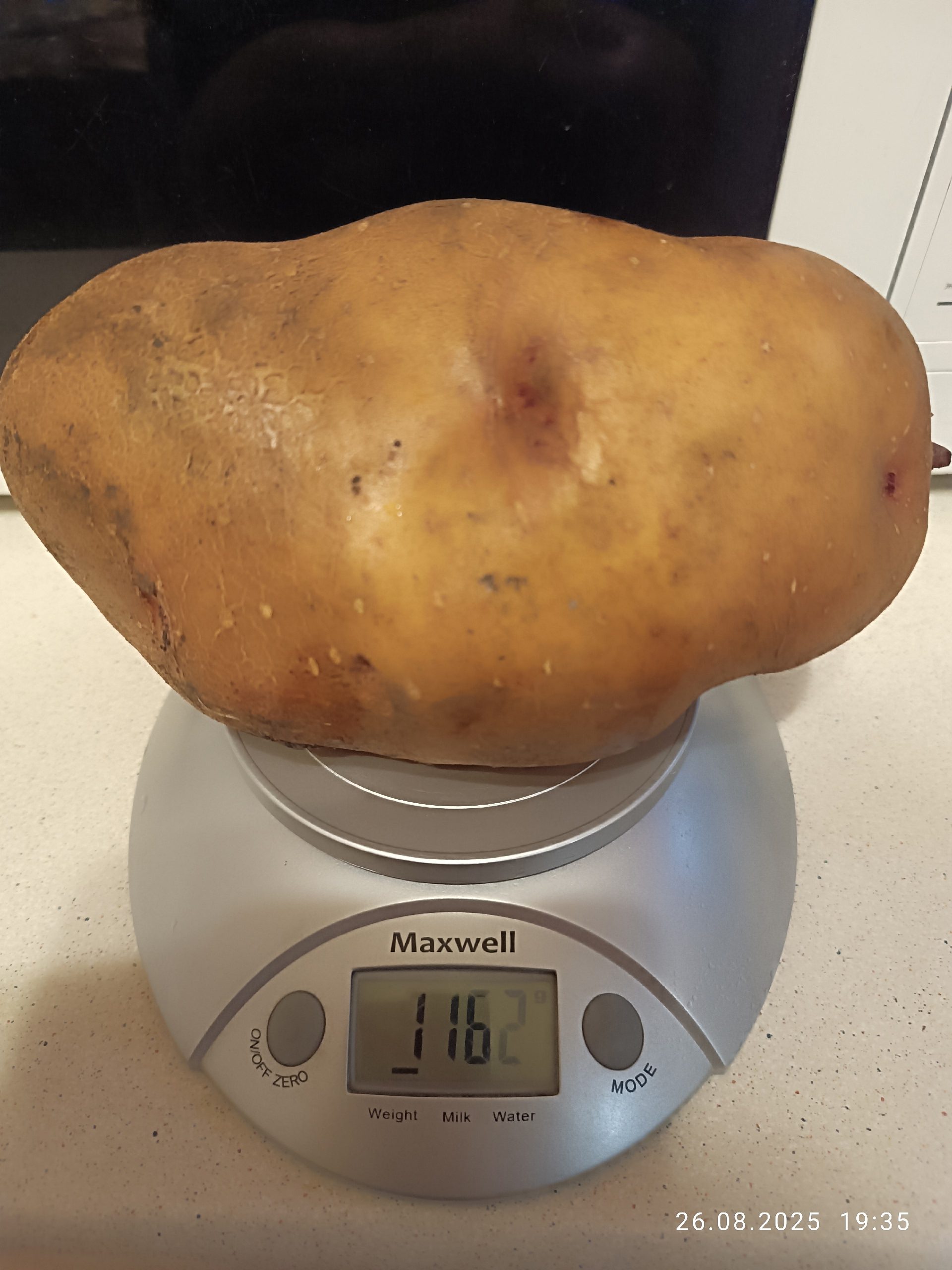 А вот — картофель-«гигантелло». Именно так корнеплод описала сама дачница. Картофель выращен в с. Коротыш Ливенского района. Его вес 1 кг 162 грамма.