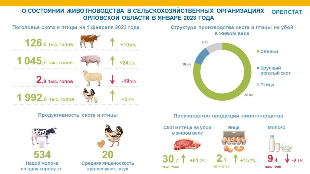 Объемы производства мяса (в живом весе) выросли по сравнению с январём прошлого года по следующим видам: крупного рогатого скота – на 112,7%, свиней – на 93,6%, овец – на 145,5 %, птицы – на 6,7%, сообщила пресс-служба Орёлстата.
