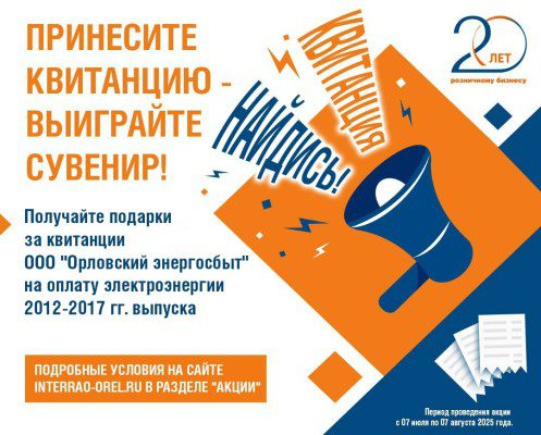 По случаю 20-летия ООО «Орловский энергосбыт» и всего энергосбытового бизнеса Российской Федерации проводится акция «Квитанция, найдись!» среди тех клиентов компании, кто бережно хранит частицы истории – а именно квитанции 2012-2017 годов выпуска. Акция проводится с 7 июля по 7 августа 2025 года.