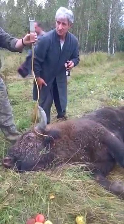 После освобождения из западни зубр некоторое время приходил в себя. За это время сотрудники лесничества оказывали животному первую ветеринарную помощь, а также выкладывали корм.