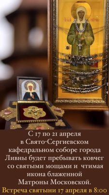 В Ливны прибудет ковчег с частицей мощей и икона блаженной Матроны Московской. Святыни будут находиться в Свято-Сергиевском кафедральном соборе.