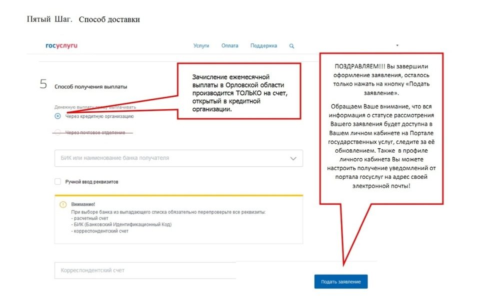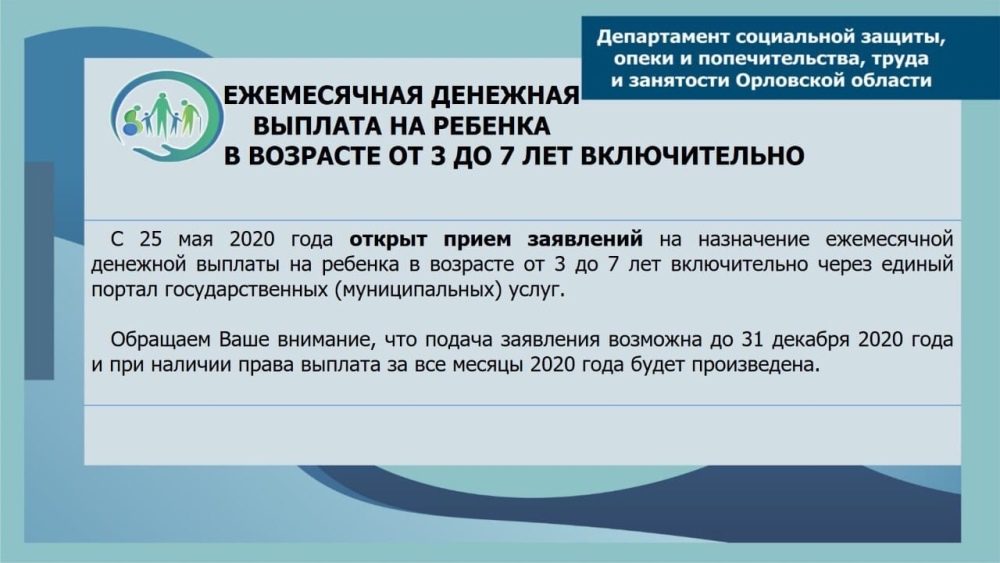 Также департамент социальной защиты, опеки и попечительства, труда и занятости Орловской области подготовил пошаговый алгоритм заполнения заявления на получение ежемесячной денежной выплаты на детей в возрасте от 3 до 7 лет на портале Госуслуг. Подробная фото инструкция позволит без труда оформить данное пособие всего за пару минут. Подача заявлений началась 25 мая и продлится до 31 декабря.