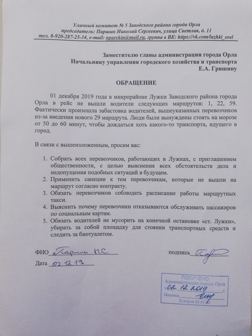На видеотрансляции орловец показывает пустующую остановку на Лужках. В течение часа он ждал маршрутку. На стриме орловец не только рассказал о предполагаемых причинах забастовки, но и пообещал написать жалобу начальнику управления городского хозяйства и транспорта Евгению Гришину. И написал.