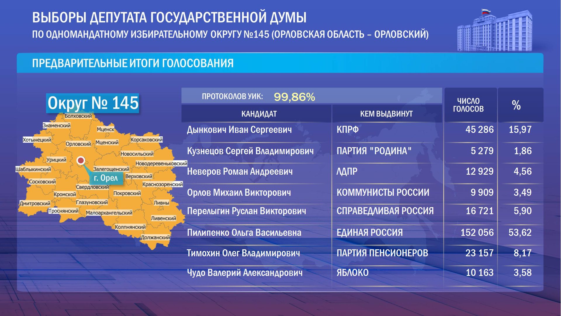 По состоянию на 9:00 в Орловской области обработано 99,86% протоколов участковых избирательных комиссий (УИК). Первое место по итогам голосования занимает член «Единой России» Ольга Пилипенко – 53,62% и 152056 голосов, за неё следует коммунист Иван Дынкович – 15,97% и 45286 голосов, замыкает тройку кандидат от партии «Пенсионеров» Олег Тимохин – 8,17% и 23157 голосов. Четвёртым стал член «Справедливой России» Руслан Перелыгин – 5,90% и 16721 голос. Остальные четыре кандидата набрали менее 5%.