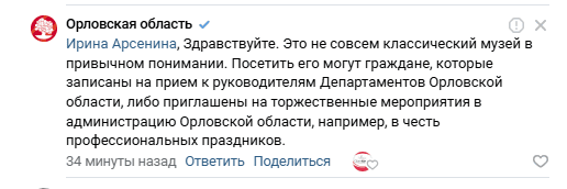 «Это не совсем классический музей в привычном понимании. Посетить его могут граждане, которые записаны на приём к руководителям Департаментов Орловской области. либо приглашены на торжественные мероприятия в администрацию Орловской области, например, в честь профессиональных праздников», — сообщили с аккаунта регионального правительства в официальном сообществе ОрелТаймс ВКонтакте, отвечая на вопросы жителей.