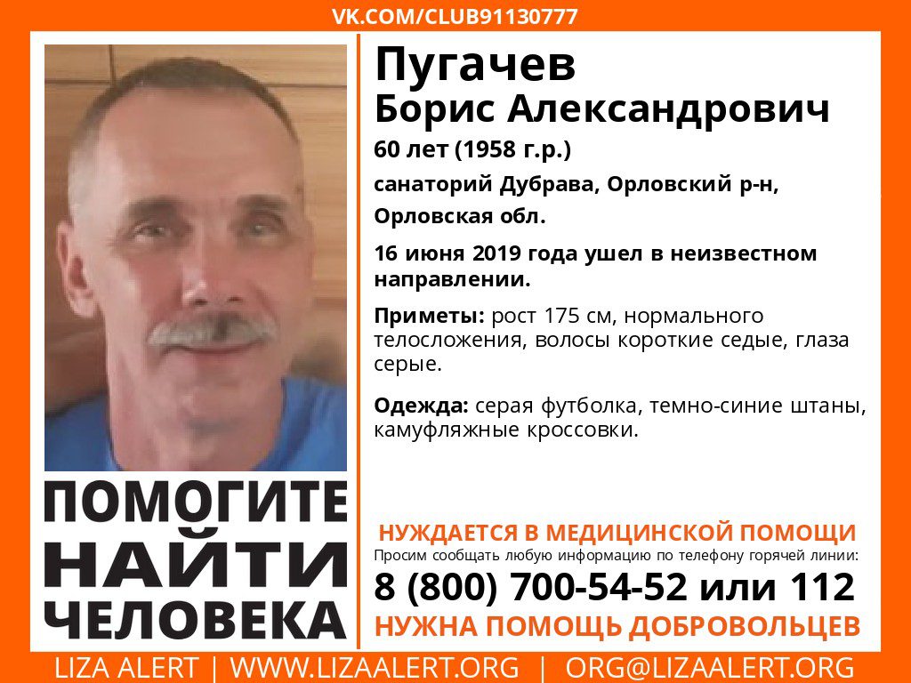 Родственники ищут Пугачёва Бориса Александровича. На странице поискового отряда Лиза Алерт появилась информация о том, что пропал 60-летний мужчина.