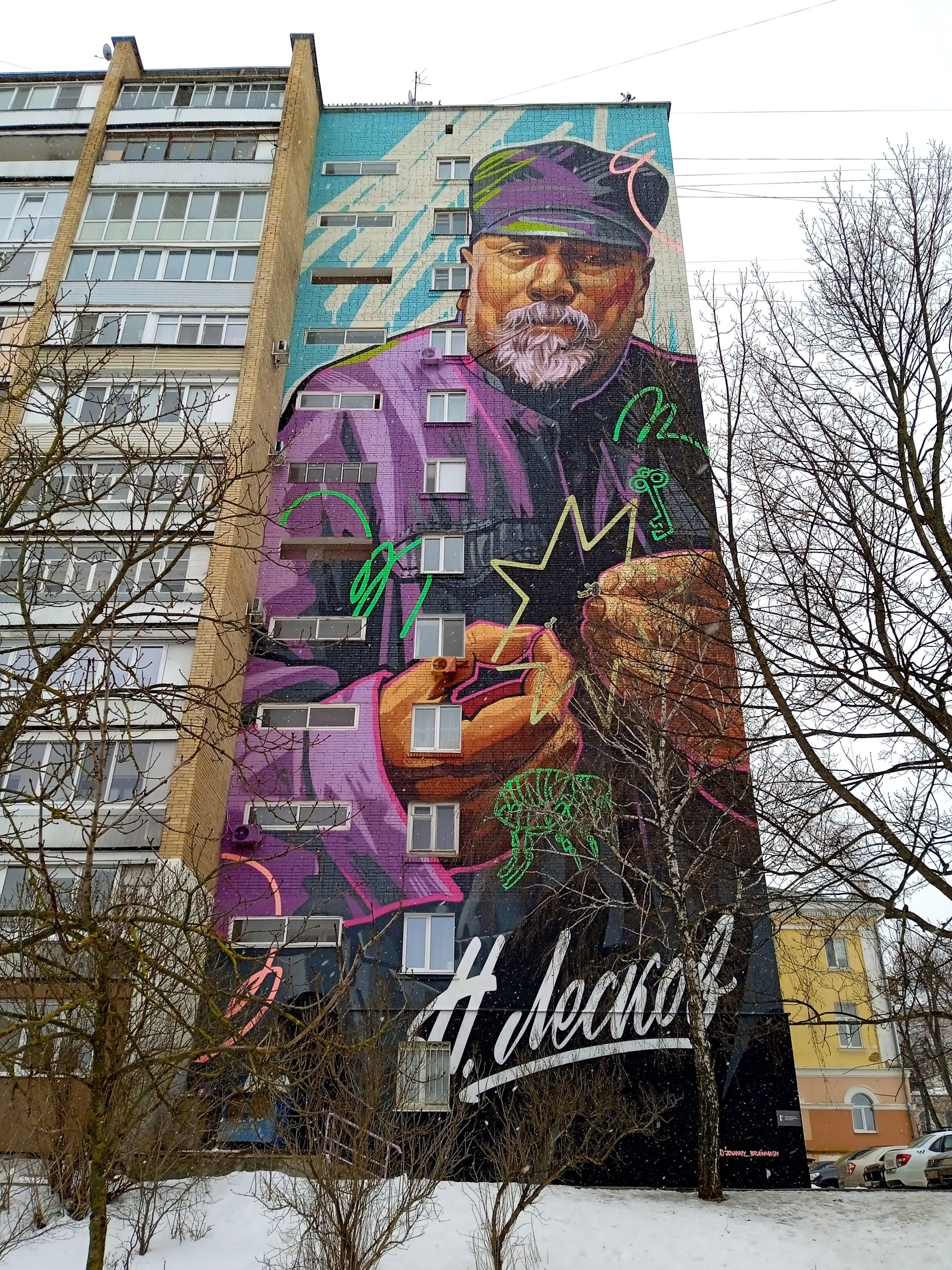 Да, действительно существует фотография писателя (одна-единственная), на которой он запечатлён в подобном головном уборе. Но… Как бы это сформулировать… «Неканоническое» это изображение! Большей части рядовых потребителей культуры (ничего обидного в этом определении нет) Николай Семёнович известен в ином обличии – таким, каким он изображён на памятнике близ Александровского моста. А на мурале писатель, лишённый привычных отличительных черт, получился неузнаваемым! В своём дурацком картузе да в сочетании с весёленькими кислотными красками он напоминает не то умудрённого жизнью таксиста, не то престарелого исполнителя блатного шансона.