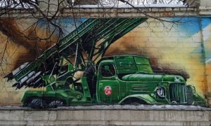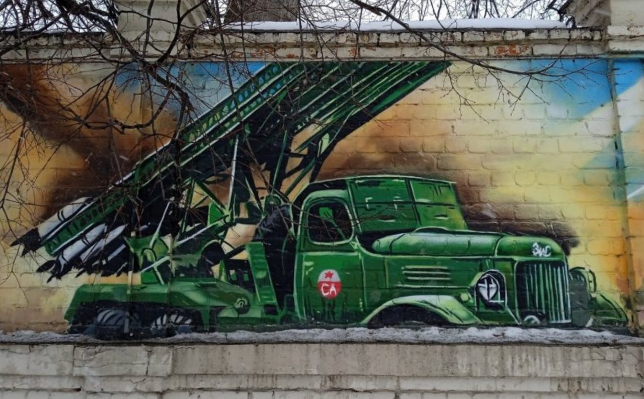 Вопросы вызывает и изображённая на стене стадиона «Катюша». Первоначально многозарядные реактивные пусковые установки БМ-13 (именно их прозвали «Катюшами») устанавливались на шасси отечественных грузовиков ЗиС-6. Впоследствии – с началом поставок по ленд-лизу – для этой цели чаще всего использовался полноприводный трёхосный американский автомобиль Studebaker US6, внешне отдалённо напоминающий наш ЗиС-151. Может, американскую машину пытались изобразить? Нет! Чтобы сомнения в патриотичности ни у кого не возникли, на капоте написано «ЗиС». И плевать, что ЗиС-151 начали производить (в том числе и под «Катюшу») лишь в 1948 году.