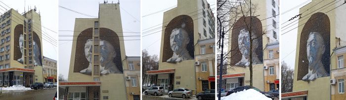 Интересно, авторы этого мурала – художники Александр Помазков и Алексей Таракин сами выбрали ступенчатый в плане фасад здания или вынуждены были довольствоваться тем, что предложил «город»?
