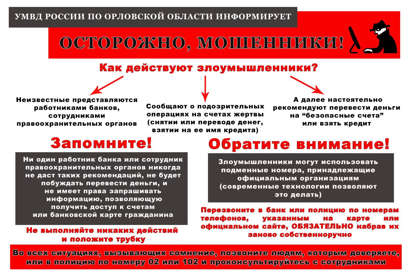 Сотрудники полиции обращают внимание на изобретательность мошенников. В МВД просят орловцев не вступать в диалог с неизвестными, даже если они представляются работникамм банков, сотрудниками различных организаций и сообщают о подозрительных операциях с вашими деньгами, предлагают перевести сбережения на «безопасные счета», взять кредит и т.д. Это мошенники.