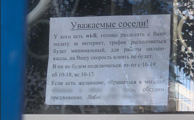 «Уважаемые соседи! У кого есть Wi-Fi, готовы разделить с Вами оплату за интернет, трафик расходоваться будет минимальный, для работы онлайн-кассы, на Вашу скорость влиять не будет. В пн не будем подключаться, вт-пт с 10 до 19, сб 10-18, вс 10-17. Если есть желающие, обращаться в магазин…».
