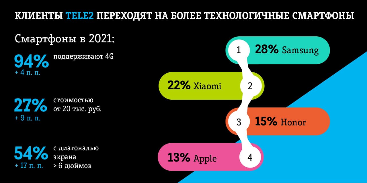 Альтернативный оператор мобильной связи Tele2 проанализировал предпочтения пользователей смартфонов в 2021 году. Клиенты компании стали чаще выбирать устройства LTE в более дорогом сегменте, что удлинило срок жизни этих гаджетов. Лидером по проникновению в сети Tele2 остаются смартфоны Samsung с долей 28%. Самую высокую динамику показали аппараты Xiaomi, которые приросли на 4 п. п., а в Орловской области прирост составил 5 п. п.