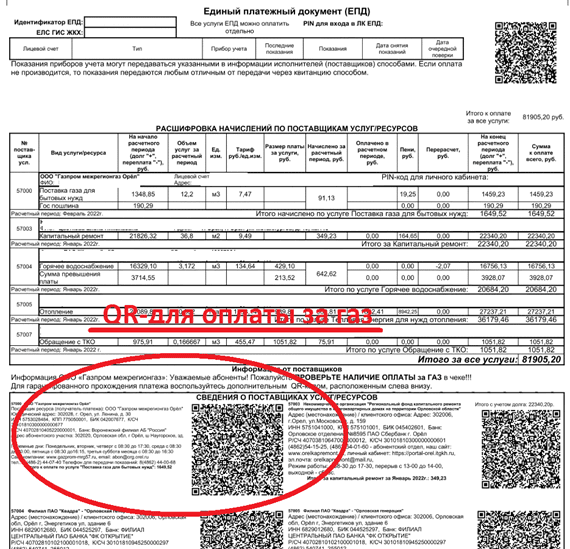 Информируем Вас, что в связи с изменением порядка оплаты комиссии при приёме платежей за газоснабжение, платёжные агенты в феврале 2022 года проводят перенастройки программного обеспечения в режиме непрерывного обслуживания клиентов. ПАО Сбербанк ввёл временный порядок оплаты за газ по индивидуальному (нижнему) QR-коду Единого платежного документа. При оплате за газ в ПАО Сбербанк потребителям необходимо дополнительно передать показания приборов учёта.