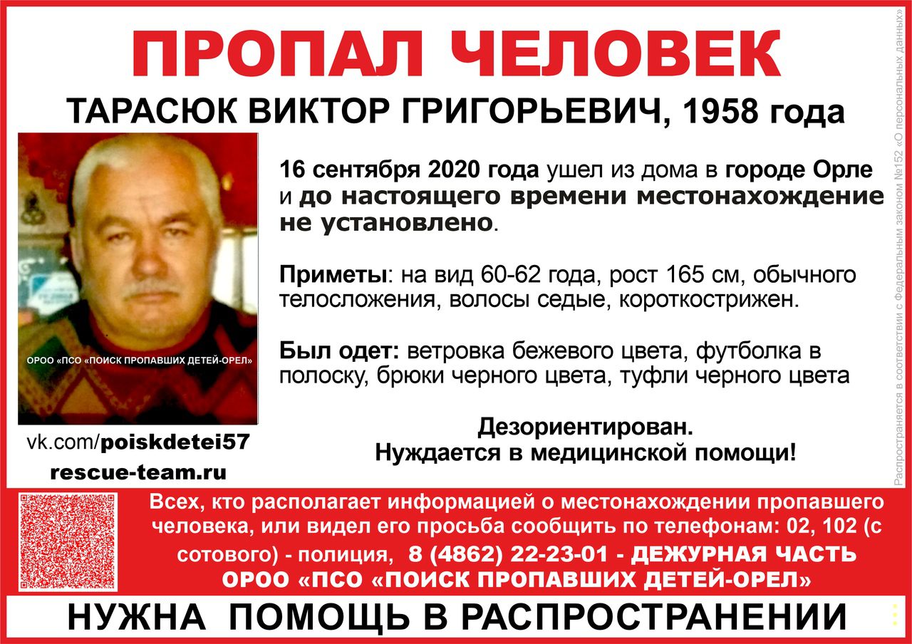 Сотрудники полиции, поисковики и родственники разыскивают Виктора Григорьевича Тарасюка. Мужчина 1958 года рождения ушёл из дома 16 сентября 2020 года и до сих пор не вернулся.