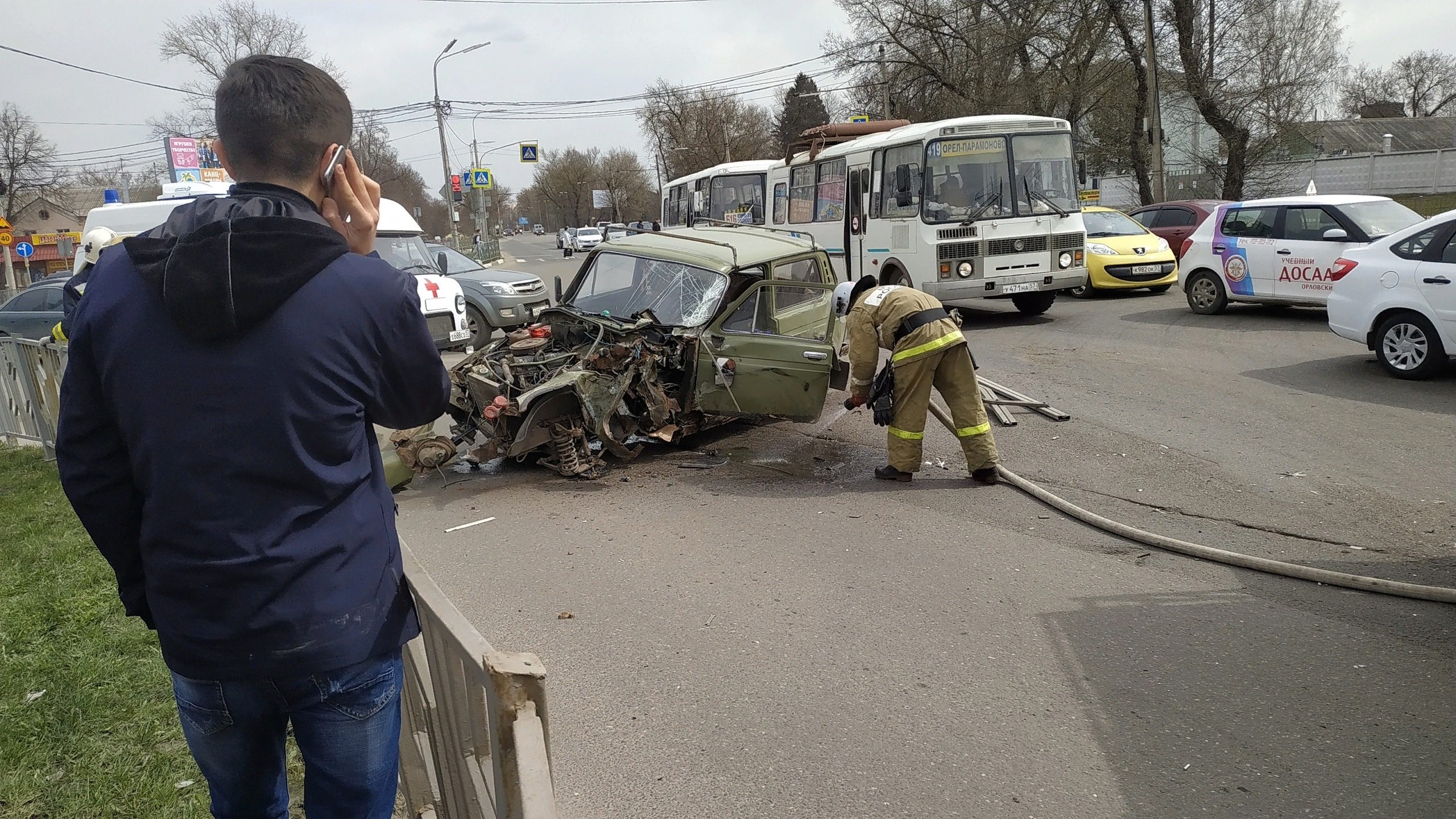 Авария произошла сегодня, 18 апреля, на Карачевском шоссе в Орле. Столкнулись «Нива» и фура «Ман». Фура шла с автовокзала на жёлтый, а «Нива» следовала по улице Спивака.