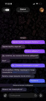 Однако во вторник в чате появилась пользователь под именем Дарья, который предложил к покупке три билета на мюзикл «Яга». Желающих нашлось порядка десятка. Большая их часть впоследствии оказались и без денег, и без билета. Люди перевели требуемую сумму, а электронных билетов так и не дождались. Причём как пишут сами пострадавшие, мошенник им сообщал счета в разных банках.
