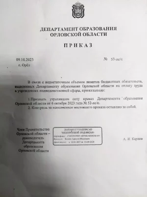 К слову, газета опубликовала копию приказа руководителя Департамента образования области Андрея Карлова. 9 октября он подписал новый приказ №53-лс/п, которым отменил свой предыдущий (№52-лс/п от 6 октября 2023 года) о начислении премий. «В связи с недостаточным объемом лимитов бюджетных обязательств, выделенных Департаменту образования Орловской области на оплату труда в учреждениях подведомственной сферы, приказываю: Признать утратившим силу приказ Департамента образования Орловской области от 6 октября 2023 года №52-лс/п. Контроль за исполнением настоящего приказа оставляю за собой».